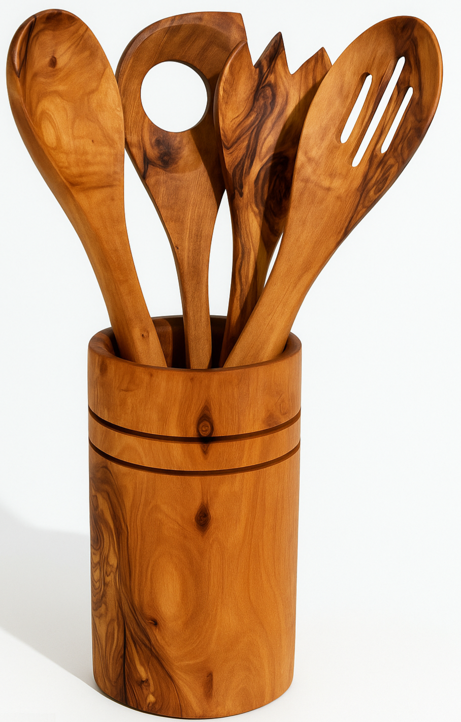 Découvrez notre lot de 4 ustensiles en bois d'olivier naturel de 25 cm avec pot, réalisé artisanalement dans un petit atelier familial. Façonnés à la main, ces ustensiles et leur pot allient robustesse et élégance pour une cuisine organisée.